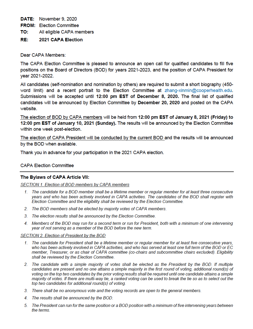 Please open 2021 CAPA BOD Election Annoucement and Candidates for further details, including the candidates’ biographies.